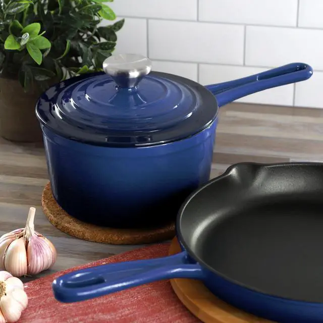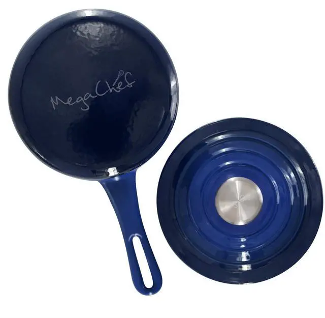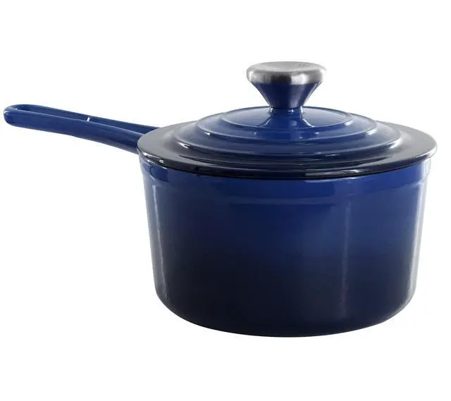 Finished in an eye-catching gradient blue enameled exterior, this 2-quart cast iron saucepan is both stylish and functional. It is oven safe up to 450°F and dishwasher safe for added convenience, seamlessly transitioning from stovetop to oven to table. Durable, versatile, and beautifully designed, the MegaChef enameled cast iron saucepan delivers reliable performance for everyday meals and special occasions alike.