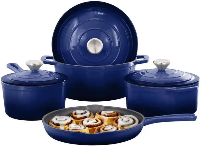 Elevate your kitchen with the MegaChef 7 Piece Enameled Cast Iron Cookware Set in a striking Gradient Blue finish. This cookware set is crafted from high-quality cast iron, known for its excellent heat retention and even heat distribution, making it perfect for everything from slow-cooked stews to quick sears. The vibrant enameled coating not only enhances the appearance but also protects the cookware from rust and damage, ensuring durability and long-lasting performance.