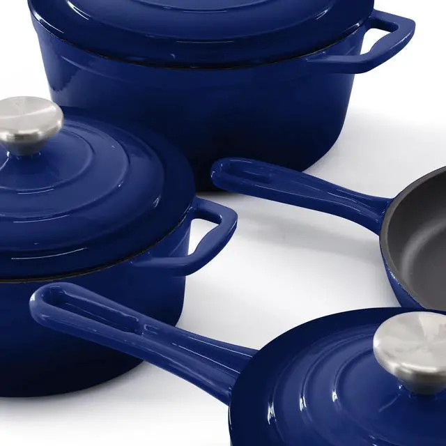 Compatible with gas, electric, ceramic, and induction cooktops, the MegaChef Enameled Cast Iron Cookware Set blends traditional craftsmanship with modern convenience. It's a stylish and practical addition to any kitchen, ideal for home cooks and culinary enthusiasts alike.