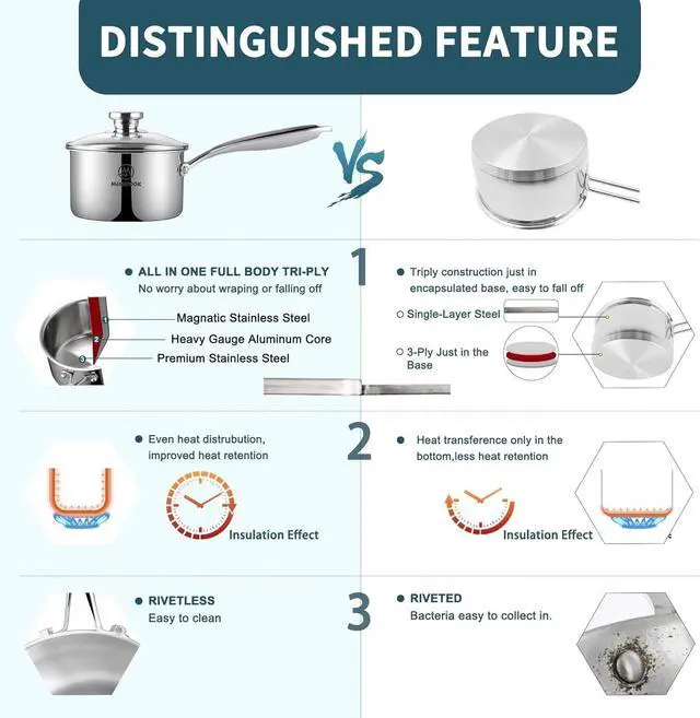 Crafted with fully clad 3-layer construction, featuring an aluminum core sandwiched between premium 18/8 stainless steel. Delivers fast, even heating from base to rim, eliminating hot spots and improving cooking efficiency.