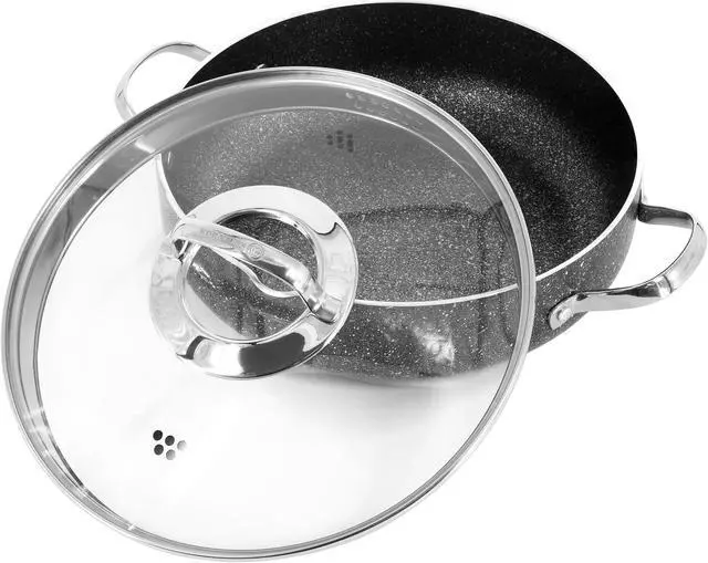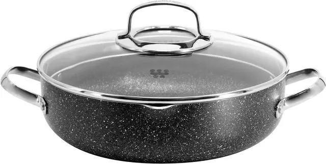 Take your home cooking to the next level with the Korkmaz Galaski Nonstick 2.8 Liter Low Casserole in black. This casserole is designed with a Volcanic-looking PTFE coating with excellent non-stick properties, making low fat cooking and easy clean up possible. Made with PFOA, cadmium, and lead free materials for a healthy and sustainable long term solution to providing the very best for your family. Features a scratch resistant surface, and a Solar Base base system that provides the highest heat transfer on all types of stoves, including induction. Constructed with 5 layers of volcanite coating for durable and long lasting use.