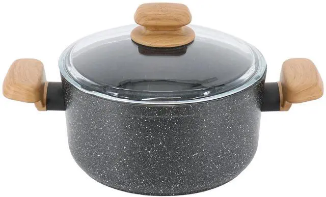 Montana, produced from recycled, completely natural material, with environmentally friendly technology, makes delicious meals using very little oil with its extra scratch-resistant volcanic-looking PTFE coating and high-temperature resistant silicone outer coating. The included glass lid allows you to keep an eye on your food while it cooks making sure your dish is perfect every time. The gorgeous black speckled appearance with faux wooden handles looks great in any kitchen.