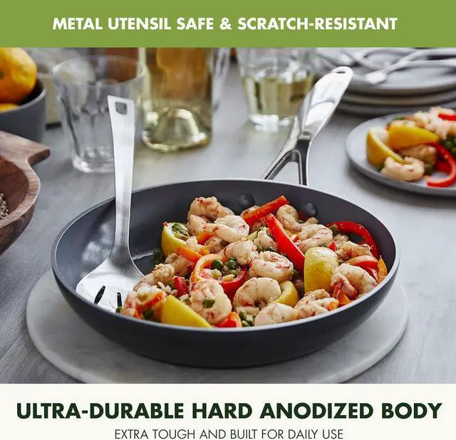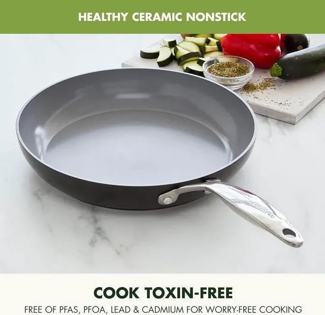 CUTTING-EDGE CERAMIC NONSTICK: Infused with diamonds, GreenPan' s metal utensil safe ceramic nonstick offers remarkable durability, balanced heating, and effortless cleanup.