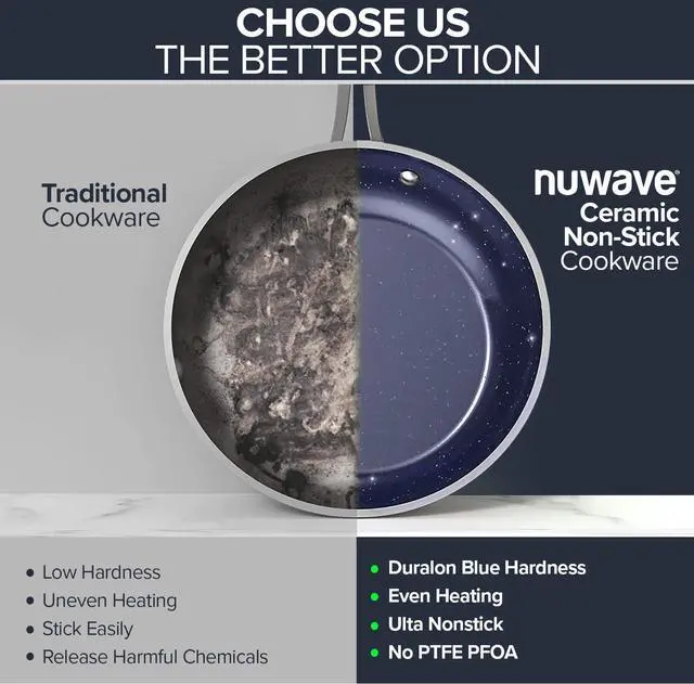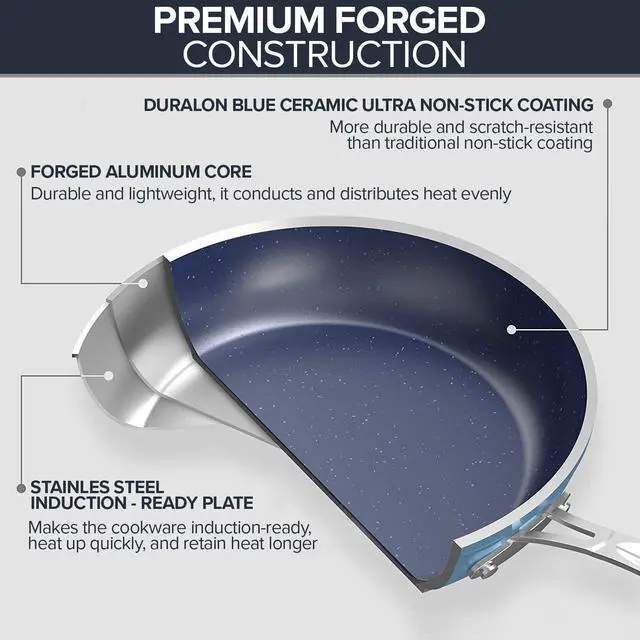 HEALTHY DURALON BLUE COATING The eco-friendly, ultra-non-stick Gen10 Duralon Blue is all-natural ceramic coating free of harmful chemicals like PFAS*, PTFE, PFOA, lead, and cadmium. It also does not emit toxic gases at higher temperatures. *Tested by TÜV Rheinland for 106 known PFAS elements and none were detected.
