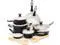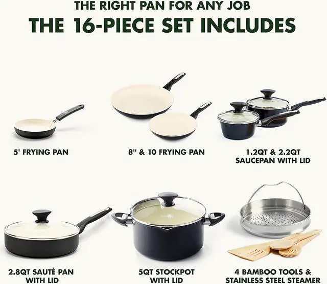 SET INCLUDES: 5, 8", and 10 frying pans, 1QT and 2QT saucepans with lids, 3QT sauté pan with lid, 5QT stock pot with lid, stainless steel steamer, bamboo solid spoon, bamboo slotted spoon, bamboo solid turner, bamboo slotted turner