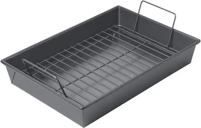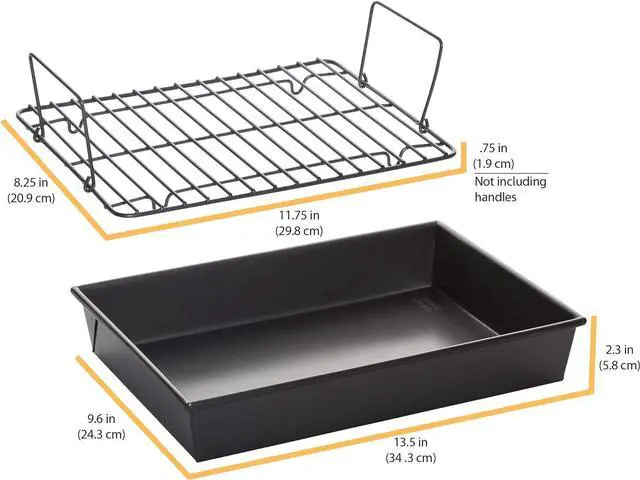 MEASURMENTS: Non-stick roast pan with non-stick rack measures 13 by 9 by 2-1/4-Inch and is heat safe up to 450 degrees F (232 degrees C).
