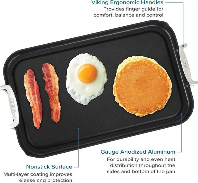 Experience even heat and exceptional release with Viking Hard Anodized Nonstick Cookware. This stove-top griddle pan is perfect as a pancake griddle, flat-top grill, or grill skillet. Make perfect pancakes or phenomenal grilled cheese.