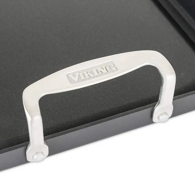 Viking ergonomic handles are crafted from stainless steel and riveted to the pan for a lifetime of durability. The handles are raised above the griddle pan so they stay cool while providing comfort, balance and contro whilel taking up less space.