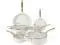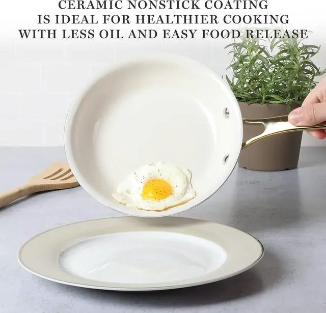 Pans Set: This cookware set includes two aluminum sauce pans with lids (1 quart and 2.5 quarts), two aluminum frying pans (8-inch and 10-inch), one 4.6 -quart aluminum sauté pan with lid, one 5.5 -quart aluminum Dutch oven with lid. All pieces contain non toxic ceramic non stick coating
