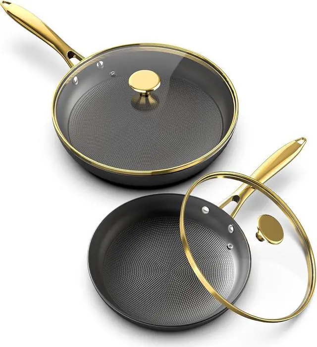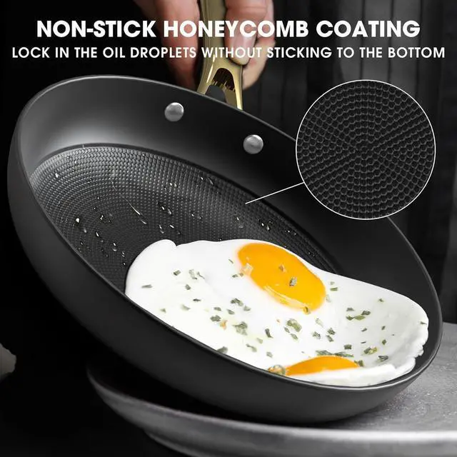 HONEYCOMB NONSTICK COOKING SURFACE: imarku frying pans use honeycomb nonstick technology and an etching process to etch a precise concave-convex texture on the bottom of the pans, effectively preventing the food from sticking and ensuring the oil droplets are evenly distributed. This minimizes oil use and helps reduce fat intake, better keeping the original delicious taste of the ingredients
