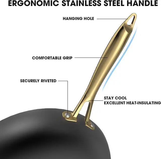 COMFORTABLE ERGONOMICS HANDLE: The non stick frying pans adopt an ergonomically stainless steel double riveted handle, which is safe, stable, durable, stylish, comfortable to grip and heat resistant to keep cool when used on the stovetop, no need to worry about burns. The hanging hole design made the frying pan set convenient to hang up