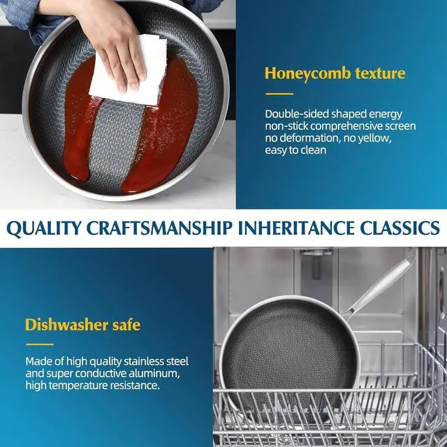 Nonstick Frying PanOne of the key highlights of this stainless steel fry pan is its sleek and modern honeycomb design, the denser line and unique honeycomb pattern creates air pockets that minimize contact between the food and the frying pan' s surface, honeycomb design and non-stick materials enhance the nonstick properties and promotes even heat distribution, resulting in perfectly cooked meals every time