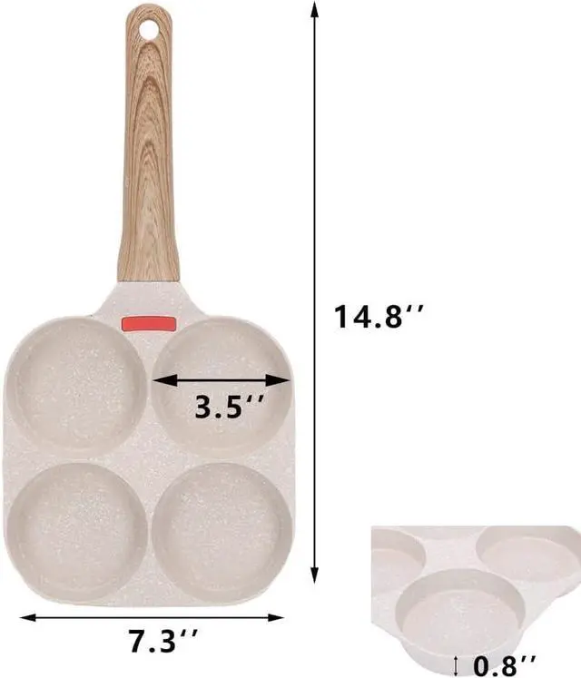 Size - Our 7.3 inch non-stick Egg Frying Pan can be used for any cooking needs: egg pan/Omelette pan/ grill pan... Its measures 14.8 * 7.3 * 7.3 inches, each cavity measure 3.5 inches diameter, please confirm the size before purchasing.