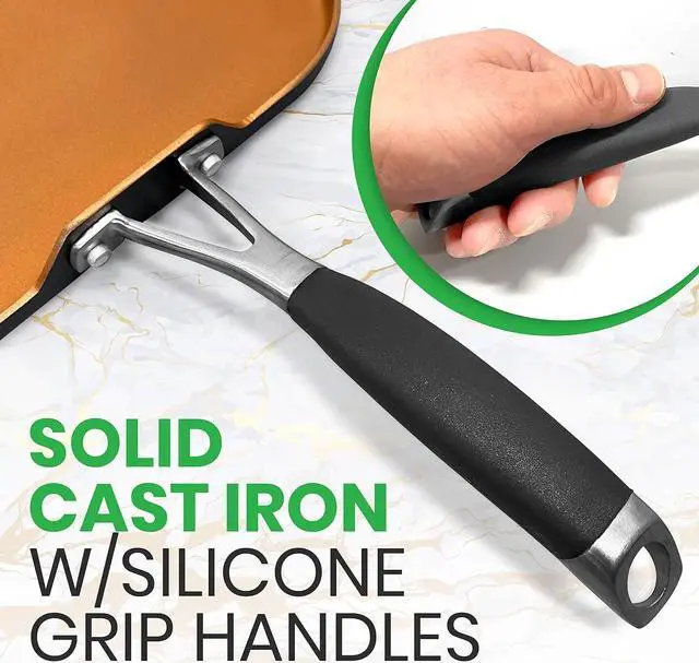 HANDLES THE HEAT: bold-colored, high-quality pressed aluminum metal provides a confident grasp and solid cast iron with silicone grip handles.
