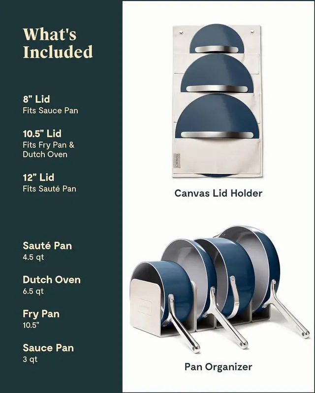 S IN THE BOX: Included in this 12-piece cookware set is a 10.5 " frying pan, 3 qt. sauce pan with lid, 6.5 qt. dutch oven with lid, 4.5 qt. sauté pan with lid, 4 modular magnetic pan racks and a canvas lid holder with hooks.