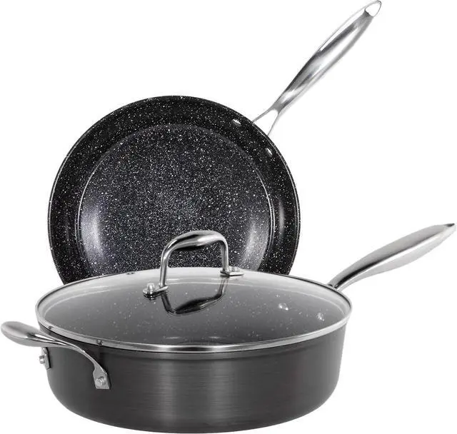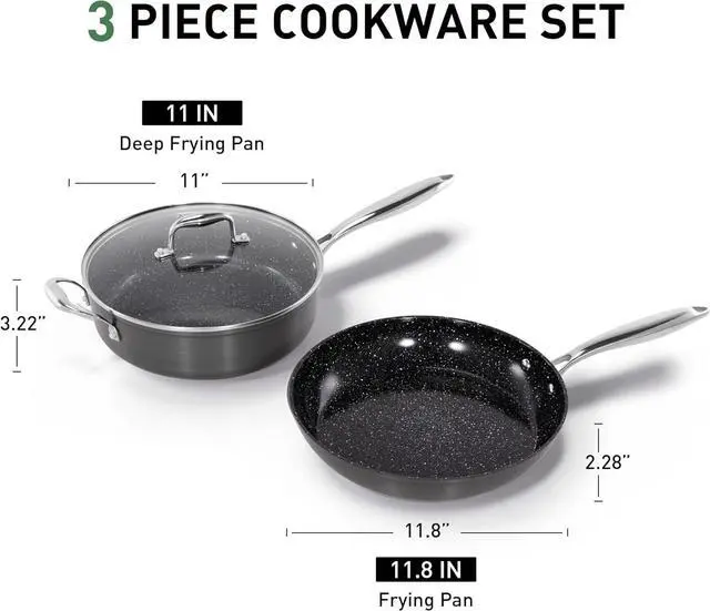 This cookware set includes 11 inch Nonstick Frying Pans & 11.8 inch saute pan with lid, ideal for browning, searing, and pan-frying foods like eggs, vegetables, and meats Its flat surface and flared side walls make it ideal for one hand sautéing and easy turning with a spatula