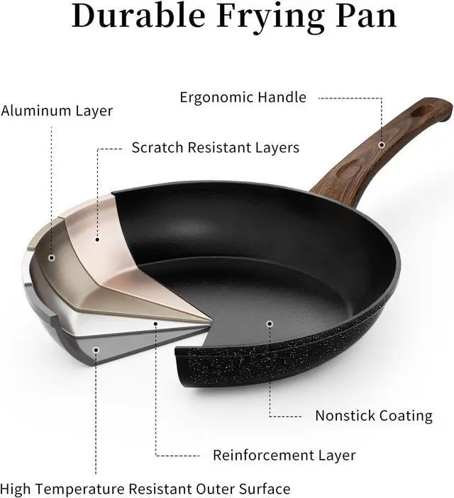 Superior Non Stick Frying Pans- Frying pans nonstick with lid set use excellent non stick coating technology, has superior abrasion resistance and extreme long-lasting. Nonstick frying pan gives us a healthy pan, less oil, non toxic, PFOA&APEO free.