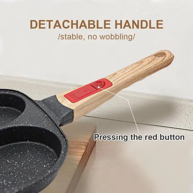 EASY STORAGE - This egg pan is newly upgraded with a removable handle that can be easily removed with just a press, eliminating the hassle of turning screws and making it easy to either hang on the wall or put in a cabinet for storage.