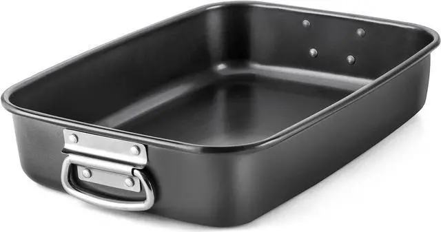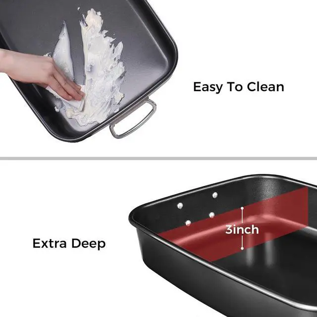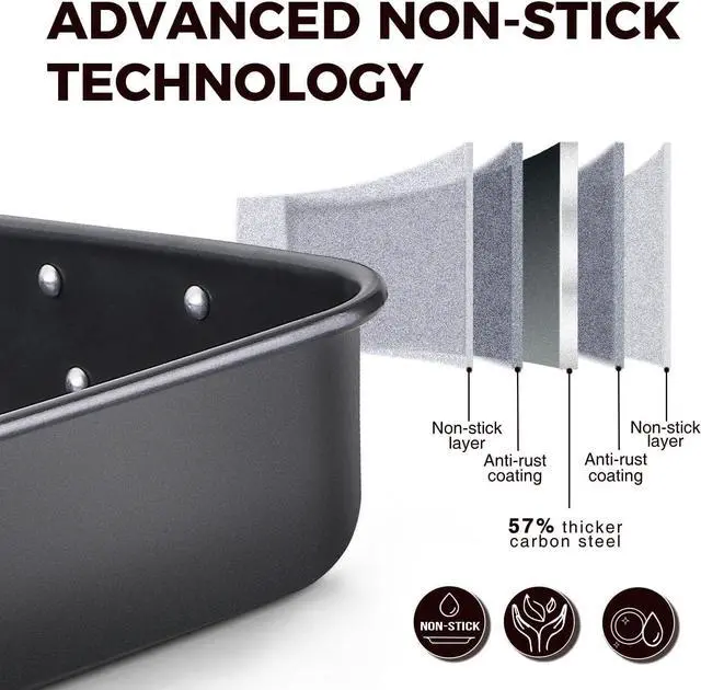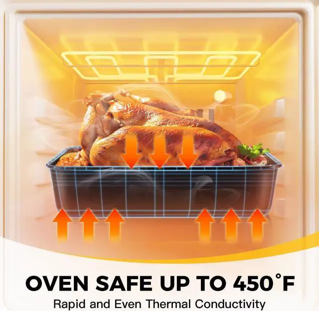 PREMIUM EXTRA-THICK MATERIAL - With 57% thicker carbon steel, this durable deep roasting pan is constructed from heavy-gauge carbon steel for stability, even heat distribution, and durability for years to come. Warranty against peeling off with heat-resistance temperature: 450.