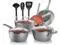 NONSTICK COOKWARE SET: Includes 1.7 qt saucepan, 3.6 qt Dutch oven, 2.1 qt cooking pot (all with lids), 11" large fry pan, 8" small fry pan, soup ladle, pasta fork, and spatula.