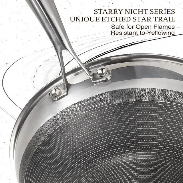 Durable 5-Layer Structure: Built with a titanium ceramic interior, 4mm thick aluminum core, and dual-layer 403 stainless steel, this wok ensures quick, even heating and excellent durability. The star-trail etched exterior resists yellowing from flames and stains, locking in heat to preserve flavors and textures.