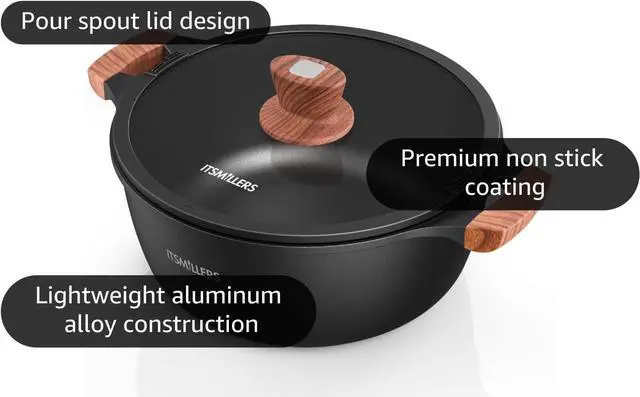 UNIQUE LID AND HANDLES - The inclusion of a pour spout lid allows for easy straining and controlled pouring, minimizing mess and enhancing convenience. The wood-design handles (NOT REAL WOOD) not only provide a comfortable grip but also add a touch of rustic charm to the pot' s overall aesthetic. It can be used to prepare a wide variety of dishes, from boiling pasta, vegetables to cooking soup. This makes it an excellent all-purpose pot for everyday use in the kitchen.