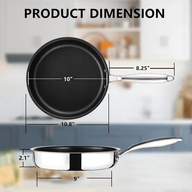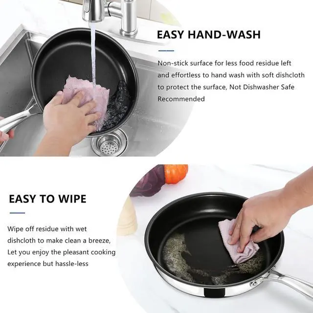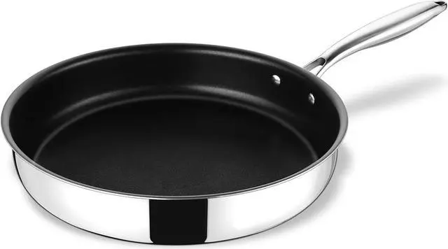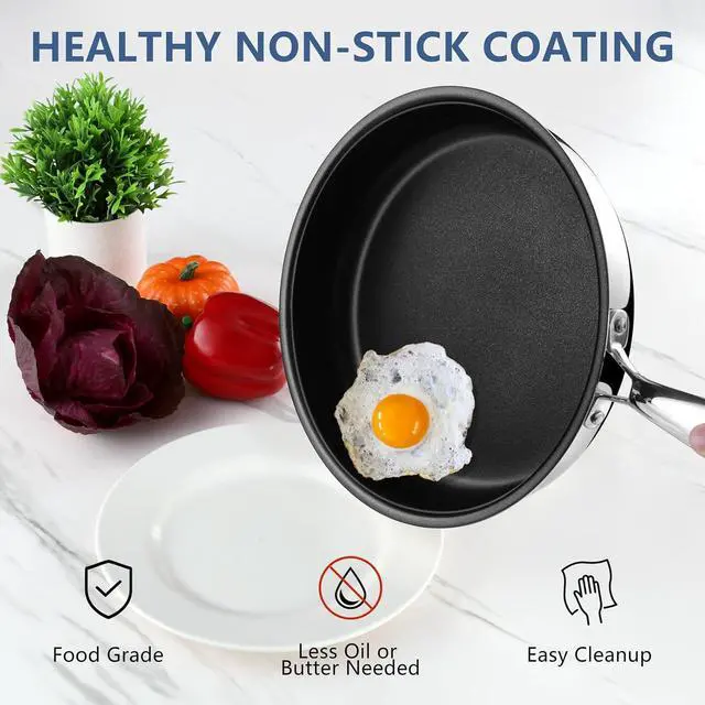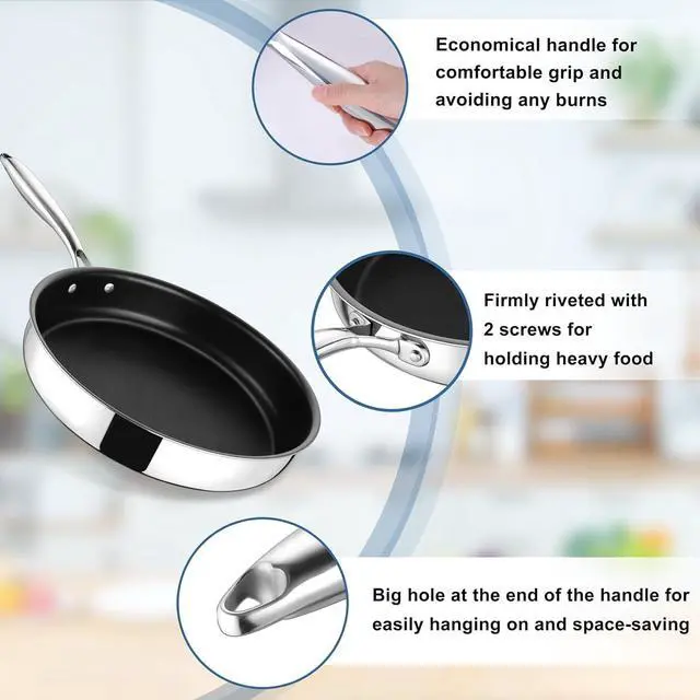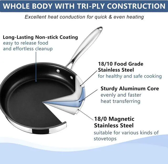 EVEN HEATING - 3-ply metallic construction made (18/10 stainless steel, aluminum core, 18/0 stainless steel) for an excellent heat conduction, The heating distributed evenly to the whole frying pan to help you cook food faster with good performance, Great for various stovetops, including induction, gas, glass top, ceramic, electric, etc.