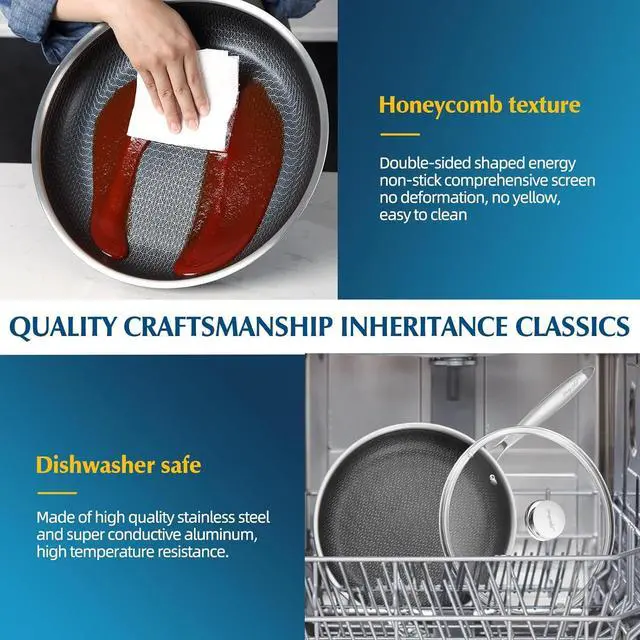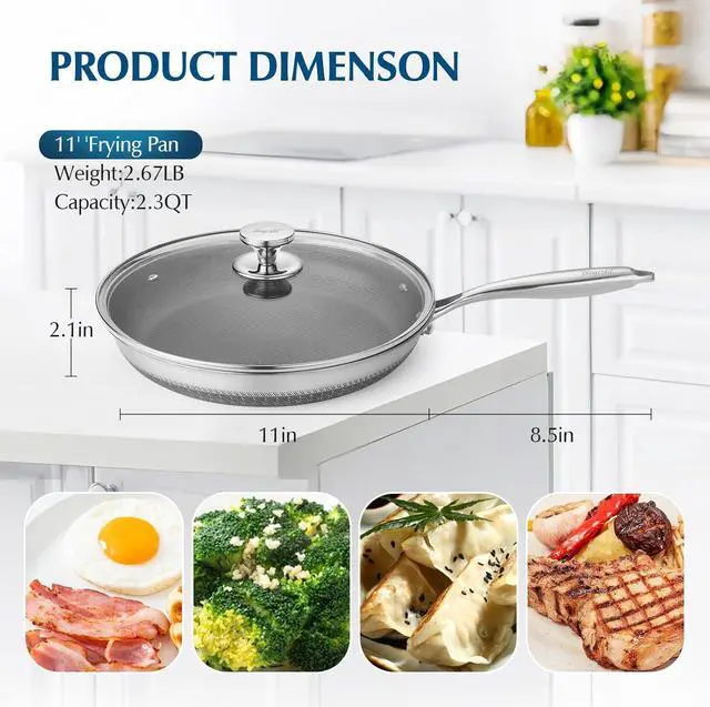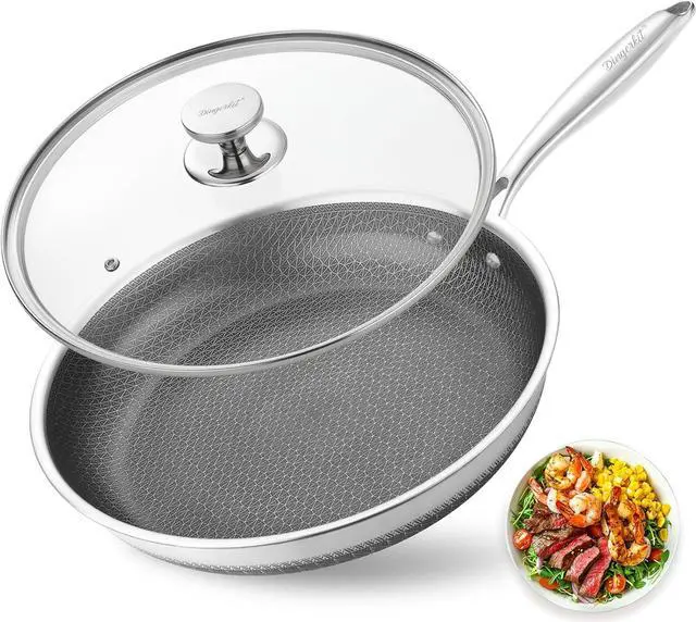 Nonstick Frying PanOne of the key highlights of Dingerkit stainless steel fry pan is its sleek and modern honeycomb design, the denser line and unique honeycomb pattern creates air pockets that minimize contact between the food and the frying pan' s surface, honeycomb design and non-stick materials enhance the nonstick properties and promotes even heat distribution, resulting in perfectly cooked meals every time