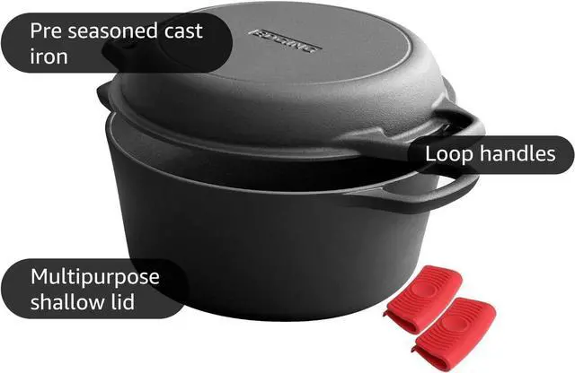 Pre-seasoned 2-in-1 cast iron dutch oven: The 2-In-1 cast iron dutch oven pot with skillet lid has been burned with vegetable oil, (no synthetic coatings or chemicals). The shallow skillet that can be used as a lid