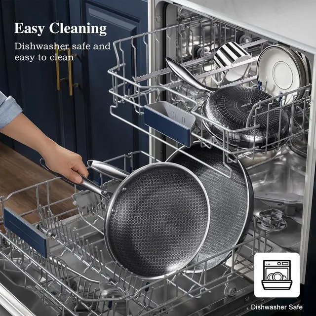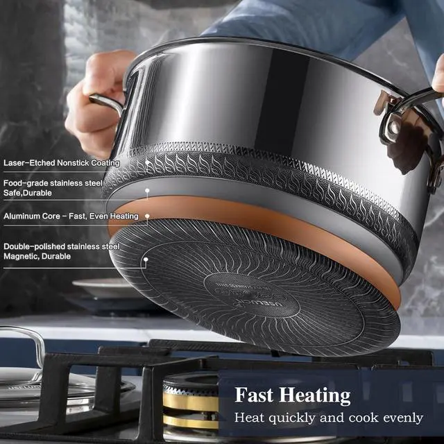 Unique & Durable Design: This non toxic pots set features a tri-ply construction (aluminum between two layers of stainless steel) with a laser-etched nonstick surface that is both scratch-resistant and durable. Its nonstick surface makes cleanup quickly and easy with just a wipe or rinse.