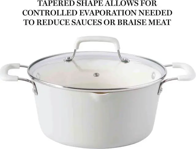 TAPERED SHAPE: Tall sidewalls follow a narrow, tapered shape to diffuse heat and regulate the rate of evaporation needed for reducing sauces or braising meat.