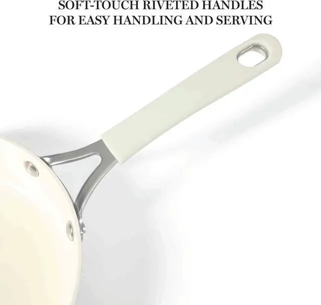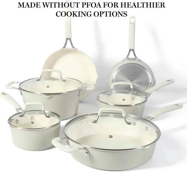 A COMPLETE SET INCLUDES: Two frying pans (8-inch and 10-inch), two saucepans with lids ( 1.3 quarts and 1.85 quarts), one 3.7 -quart sauté pan with lid, and one 4.4 -quart Dutch oven with lid. Inspired by the best-selling Lockton cookware collection from Martha Stewart, the 10-piece Heathland Ceramic Nonstick Cookware Set has taken a more sleek and leaner shape with exquisitely tapered pots and pans to contain and diffuse heat evenly.