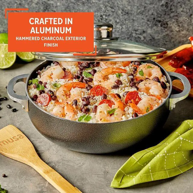 LONG LASTING AND STYLISH: This caldero is made of aluminum for long-lasting cooking performance, featuring a nonstick surface, cast aluminum riveted handles, and a hammered charcoal exterior finish for a durable and appealing design