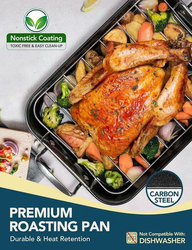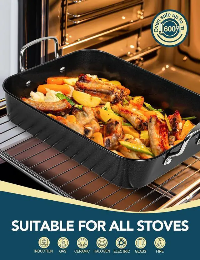 COMPATIBLE WITH ALL STOVETOPS: Crafted from durable carbon steel with a stylish dotted nonstick coating, this roaster pan boasts a sleek appearance and works seamlessly on any stovetop, in the oven or on the grill. It' s a must-have for any kitchen! (To preserve the nonstick surface, hand washing is recommended. )