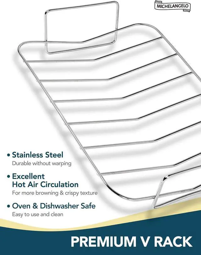 REMOVABLE STAINLESS STEEL RACK: Our turkey roaster pan features a stainless steel rack that elevates your meats and roasts, keeping them above fats and juices. The V-shaped design offers extra space for larger cuts, allowing you to add more vegetables and herbs, while sturdy handles ensure easy and safe transport.