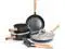 Cookware set includes: 9.5 -inch frying pan, 11-inch frying pan with lid, 1.5 -quart saucepan with pour spouts, 3-quart sauté pan with lid, nylon and wood solid turner, and nylon and wood slotted spoon