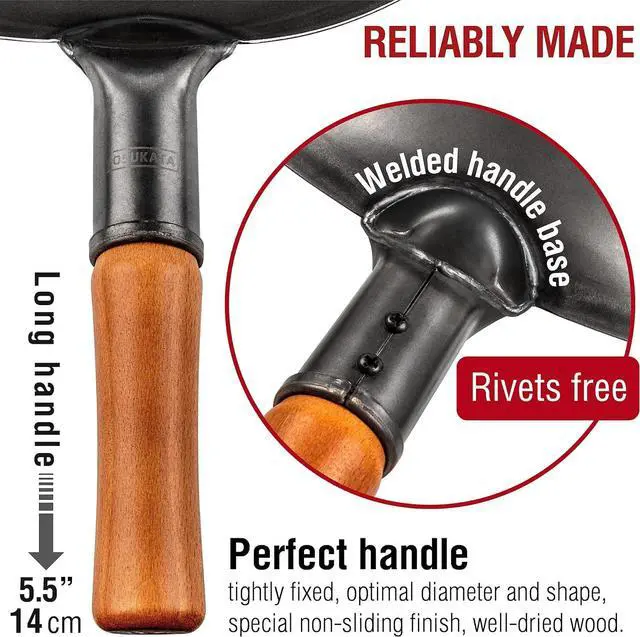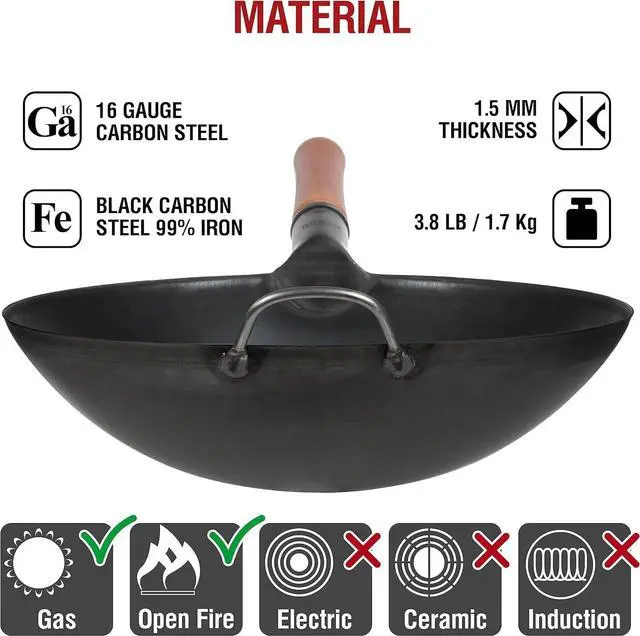HIGH-QUALITY MATERIALS: This large wok pan is made from heavy-duty, black carbon steel. The ergonomic design of the wooden handle ensures a comfy grip when you use this cooking wok
