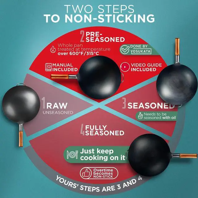 PRE-SEASONED: Our round bottom carbon steel wok is pre-seasoned at high temperatures over 600F using special technics unlike unseasoned woks and stir fry pans. The wok must be seasoned with oil before use