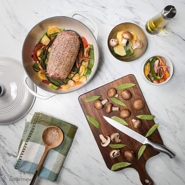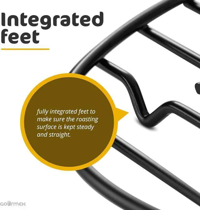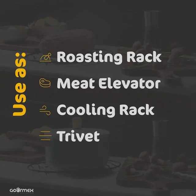 MEAT RACK FOR OVEN AND PAN- The open and clean design of the wires on the cooking racks for oven use, allows air to circulate around the food for fast, even roasting and easy cleaning. The rack allows the fat and liquids to drain while keeping the roast from sticking to the pot.