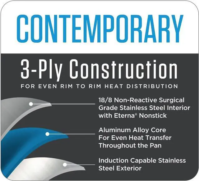 The Viking Contemporary 3-Ply Stainless Steel 10-Inch Nonstick Fry Pan combines a modern, Windsor pan inspired design with the exceptional performance of 3-Ply stainless steel cookware
