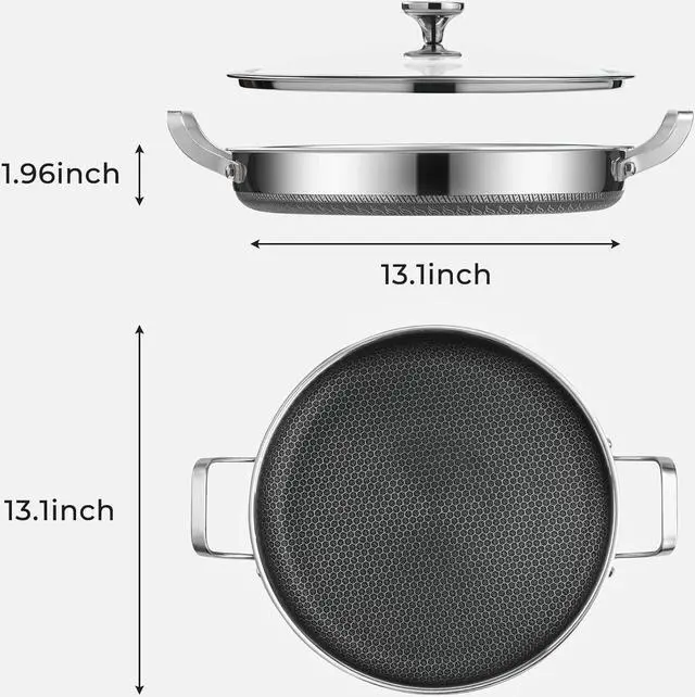 Food Grade MaterialFeatures a Premium Quality 5-Ply 316#Stainless Steel base with thick aluminum core for fast heat absorption. Our Frying Pan offers superior stick resistance and easy maintenance, plus wont react with food. Heat is evenly distributed across the whole frying pan, cooking foods faster to save you time. Also our professional-grade tempered glass lid which is 4 times stronger than untreated glass lids.