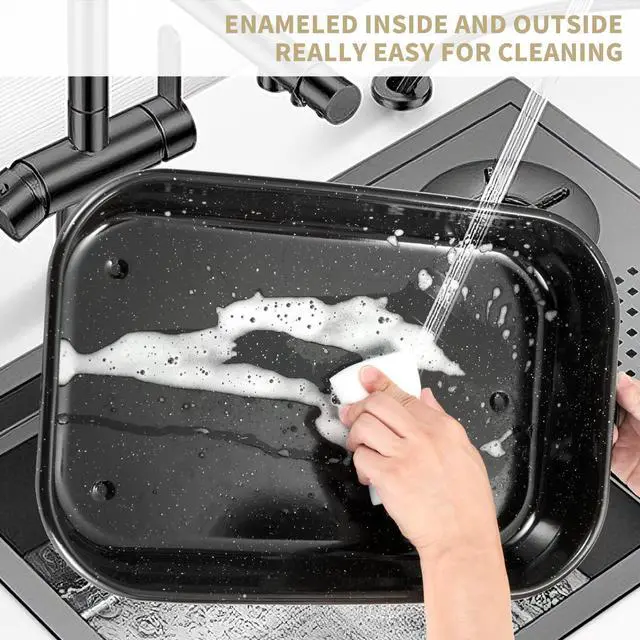 [Dishwasher Safe and Easy Clean] JY COOKMENT roaster pan is completely dishwasher safe and will not wear or fade in it. Very easy to clean even if you have to clean it manually, just soak immediately after use and use a vegetable brush to get crumbs and bits out of the cross sections, then cleaning is simply a piece of cake.