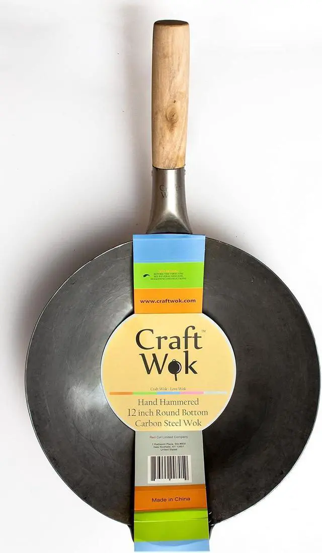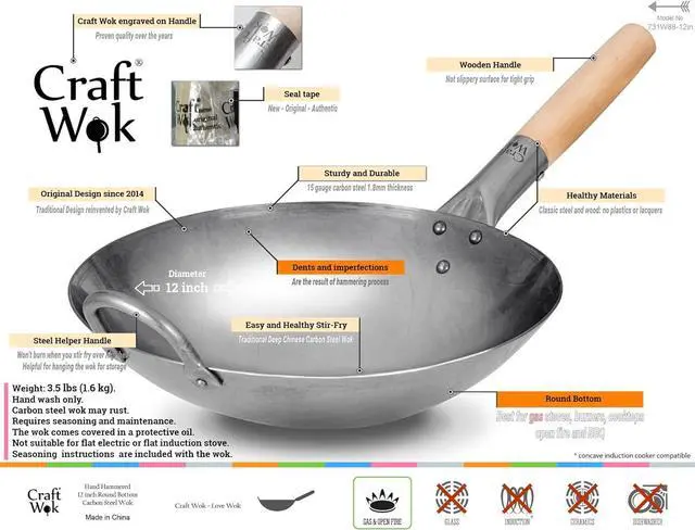 Round Bottom Heavy 12 Inch 15 gauge ( 1.8 mm) carbon steel wok, commercial grade. Original design by Craft Wok since 2014, proven quality over the years. Chinese wok pan with a round bottom.