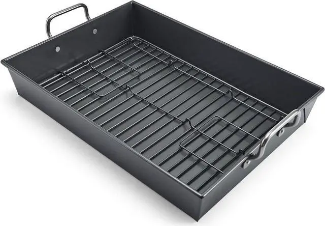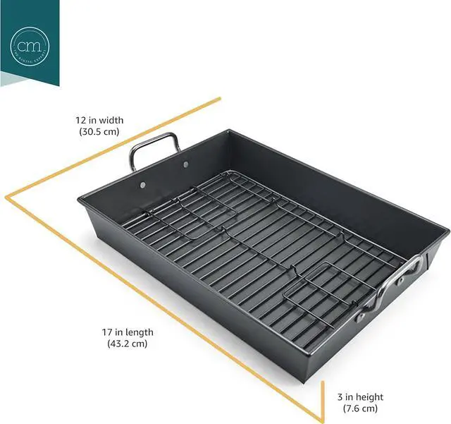 Non-stick Extra Large roaster pan with stainless steel handles and non-stick rack; pan measures 17 by 12 by 3-inch
