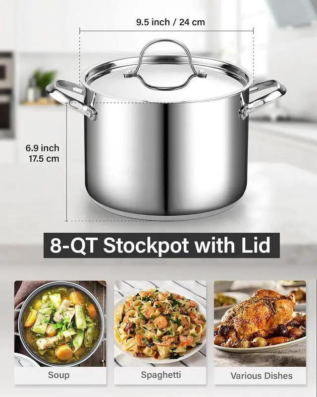 Multi-Purpose: Standard 8 quart stainless steel stockpot, suitable for cooking soups, pasta, making sauces, stews and noodles