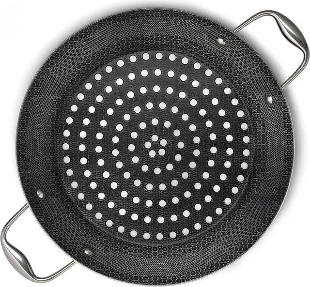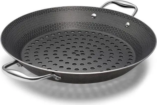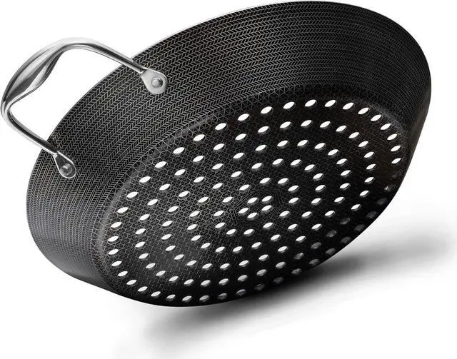 Our Hybrid BBQ Pan gives a beautiful sear to delicate ingredients like veggies without risk of falling through the grates; The perforations allow flavorful smoke to permeate food while the high, angled sides let you stir, flip and arrange with ease!