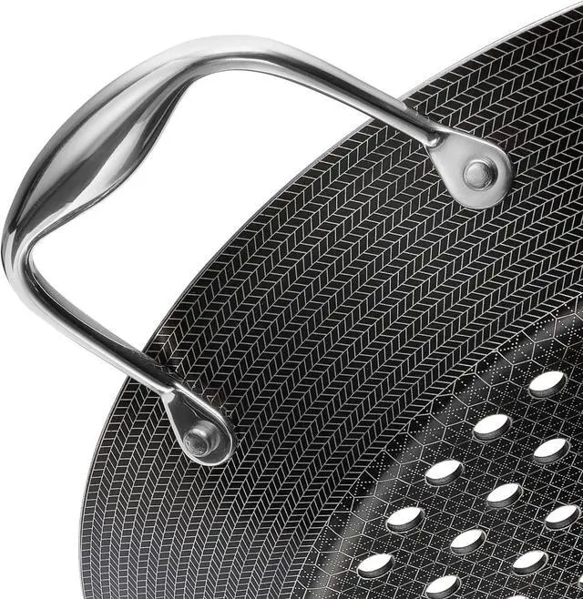 HexClad' s patented hybrid tech utilizes tri ply construction aluminum between two layers of stainless steel laser etched with our hexagonal nonstick surface to deliver the searing power of stainless, durability of cast iron and easy cleanup of nonstick!