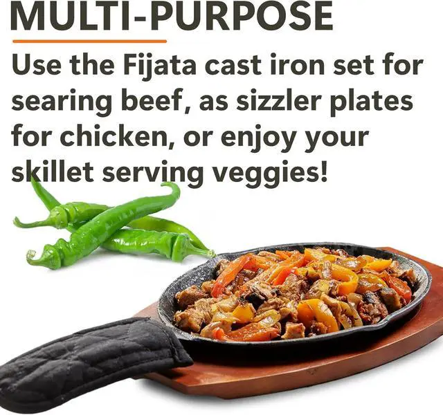 DURABLE AND VERSATILE CAST IRON SIZZLER PLATES - Crafted with the timeless durability of Lodge cast iron and other trusted brands. Built to last a lifetime, these versatile plates are perfect for elevating your grilling, cooking, and serving experiences. From mini sizzler plates with protective handle covers to durable griddles and flat cast iron skillets, each piece is designed for superior heat retention and even cooking. Perfect for professional chefs and home cooks alike, these sizzler plates ensure your dishes are served sizzling hot.