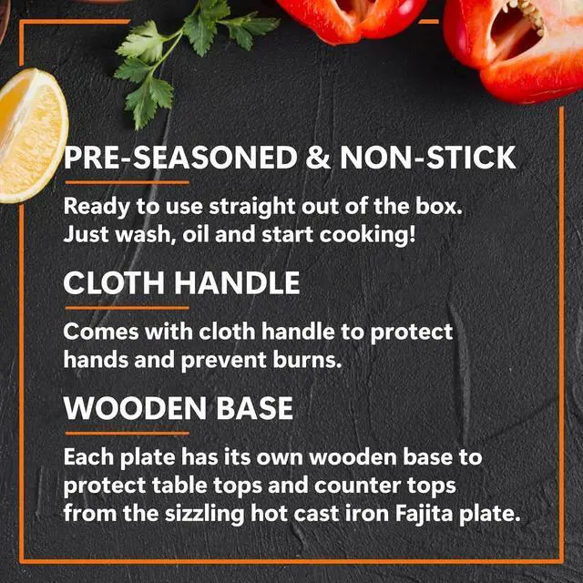 FUNCTIONAL AND STYLISH CAST IRON SIZZLING PLATES WITH PROTECTIVE WOODEN BASE - Each set features a durable cast iron plate paired with a protective wooden base, offering both functionality and elegance designed to withstand the test of time. The wooden base provides a dual-purpose benefit, shielding countertops and tabletops from the sizzling heat of the cast iron fajita plate while adding a touch of rustic charm to your presentation. Whether using a cast iron grill pan, flat cast iron skillet, or griddle.