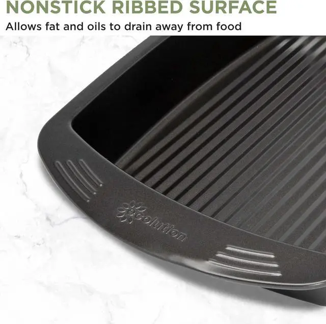 UPGRADES: The oversized handles make it easy to grip and lift this roasting pan, even with a large turkey inside. Also features a ribbed bottom that allows fat and oils to drain from food for better browning and healthier results.